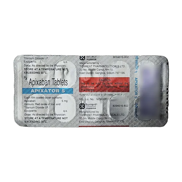Apixator 5 mg Tablet contains Apixaban, an oral anticoagulant that works by inhibiting Factor Xa, an important component involved in blood clot formation. By reducing clot formation, it lowers the risk of stroke, heart-related complications, and life-threatening clots.