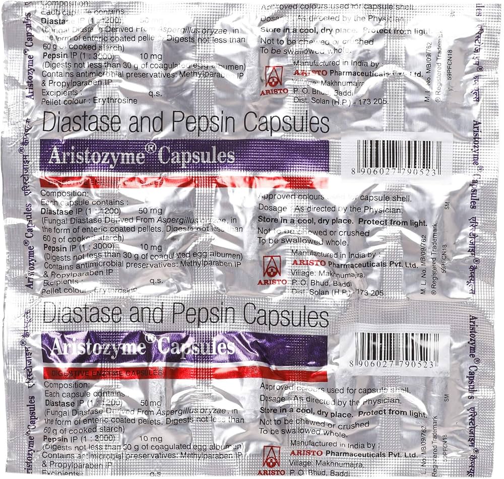 Aristozyme Capsule is a digestive enzyme supplement that supports digestion, relieves bloating and gas, and improves nutrient absorption. Ideal for indigestion, weak digestion, loss of appetite, and flatulence. 100% genuine product with fast all-India delivery and secure packaging. Return accepted only if a wrong product is delivered.
