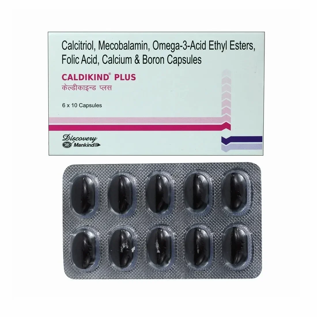 Caldikind Plus Capsule is a comprehensive bone-health and nutrient-support soft gelatin supplement combining calcium, active vitamin D3 (calcitriol), vitamin B12 (methylcobalamin), folic acid, boron and omega-3 fatty acids (EPA/DHA) to assist bone strength, nerve health and nutritional gaps.