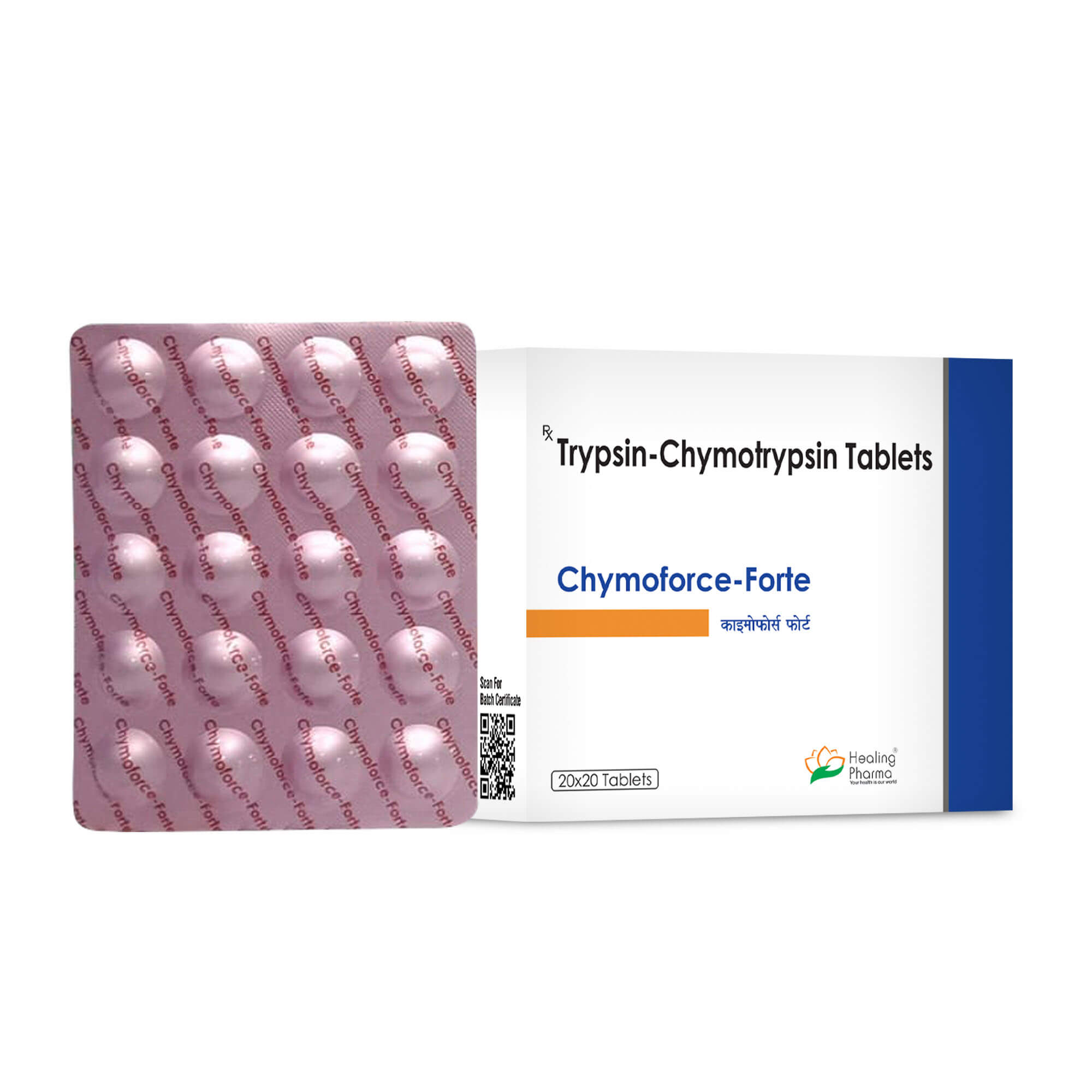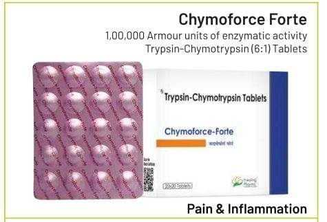 Chymoforce Forte Tablet is an enzyme-based anti-inflammatory medicine that helps reduce swelling, pain, and inflammation from injuries, surgeries, dental procedures, and sports trauma. It promotes faster healing, enhances mobility, reduces stiffness, and supports quick recovery by improving blood circulation and breaking down inflammatory proteins.