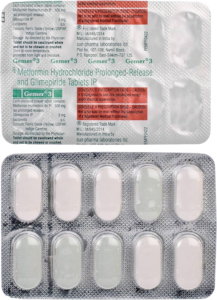 Gemer 3 mg Tablet helps control Type 2 diabetes using Glimepiride and Metformin. It reduces blood sugar, improves insulin action, and prevents diabetes complications. All India delivery. Return only if wrong product delivered.