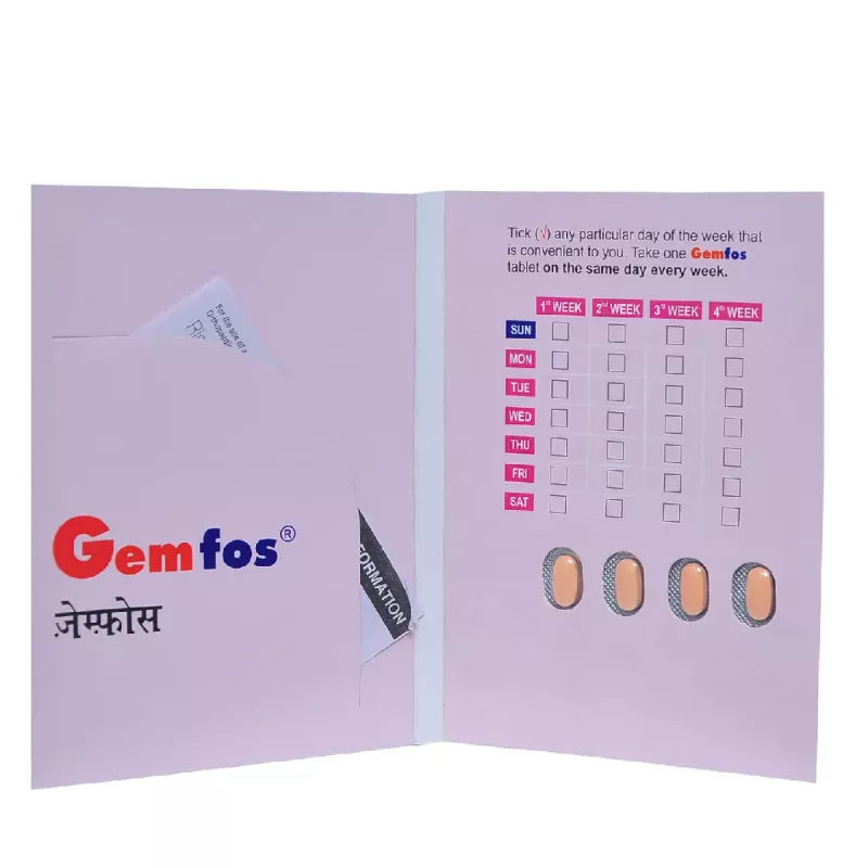 Gemfos Tablet, powered by Risedronate Sodium, is a clinically trusted bisphosphonate used to treat and prevent osteoporosis by strengthening bones and reducing the risk of fractures. It helps increase bone density and is ideal for adults and postmenopausal women with weak or thinning bones. Gemfos supports long-term bone health and is commonly prescribed for patients prone to fractures, age-related bone loss, and steroid-induced osteoporosis. For effective results, it should be taken as directed by a doctor with proper dosing instructions and lifestyle modifications for bone care.