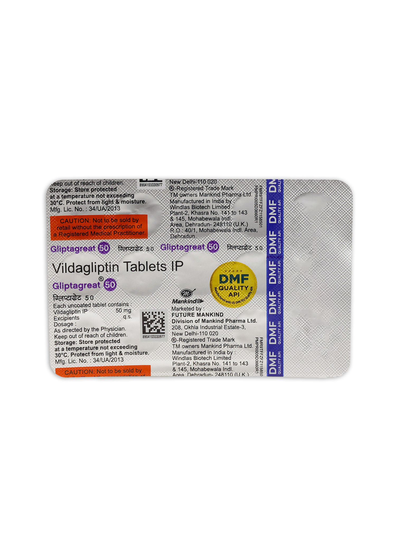 Gliptagreat 50 mg Tablet contains Vildagliptin 50 mg, an oral anti-diabetic medicine used for the treatment of Type 2 Diabetes Mellitus. It belongs to the DPP-4 inhibitor class, which helps regulate blood sugar by increasing insulin release and decreasing glucagon levels in a glucose-dependent manner.