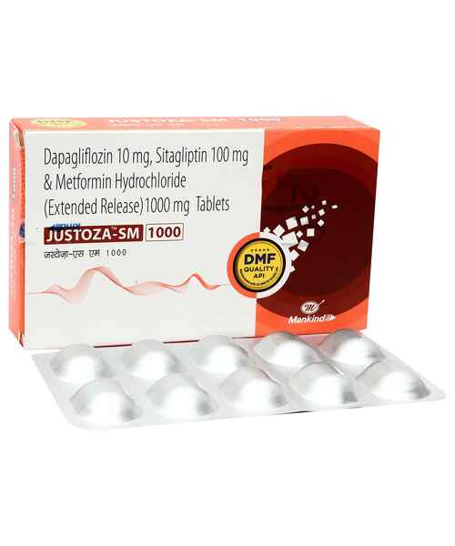 Justoza-SM 1000 mg Tablet is a combination of Dapagliflozin, Sitagliptin, and Metformin Hydrochloride (Extended Release) used for the management of Type-2 Diabetes Mellitus.