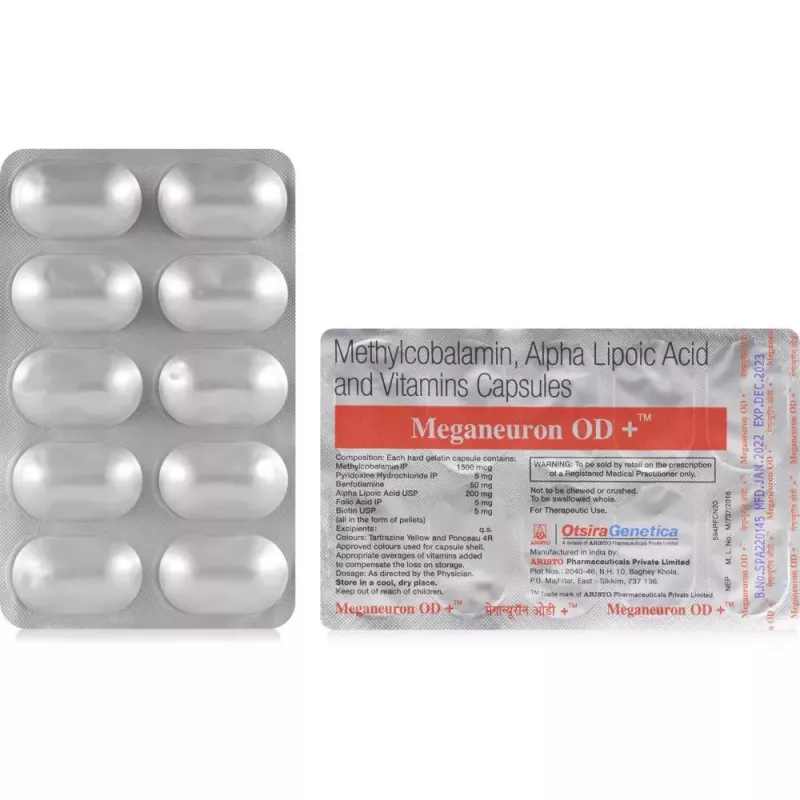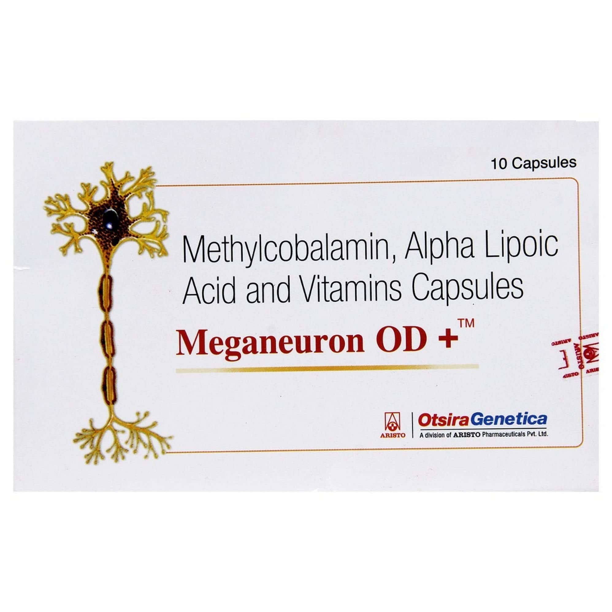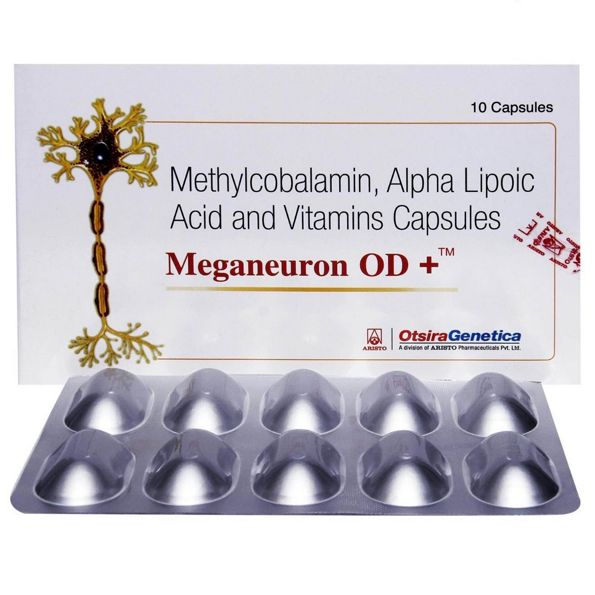 Meganeuron OD Plus Capsule is a nutritional supplement that helps improve nerve function and relieves neuropathic pain. It contains Methylcobalamin, Alpha Lipoic Acid, and Folic Acid for nerve regeneration and energy support.