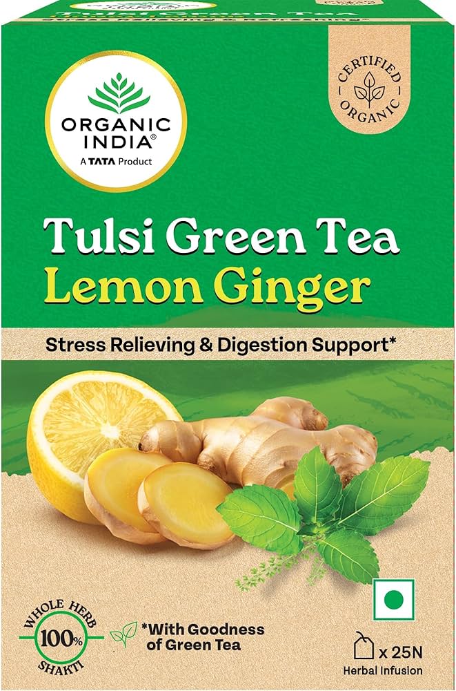 Organic India Tulsi Green Tea Lemon Ginger – 25 Tea Bags | Certified Organic Lemon-Ginger Green Tea with Tulsi for Immunity & Wellness