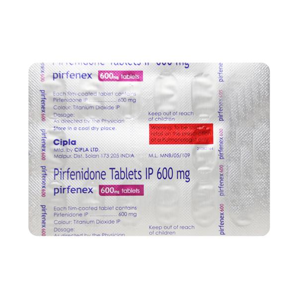 Pirfenex 600 mg Tablet contains Pirfenidone, an antifibrotic and anti-inflammatory medicine that helps slow lung scarring, reduce inflammation, improve breathing capacity, support long-term lung function, and manage idiopathic pulmonary fibrosis effectively under medical supervision — Only wrong product return.