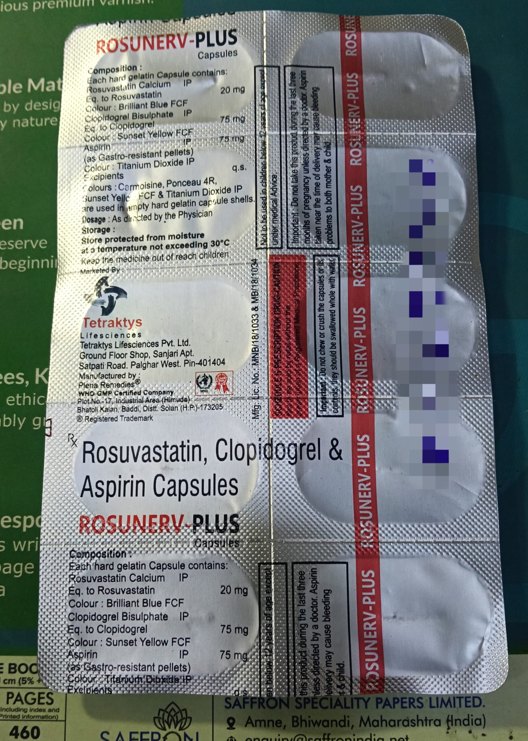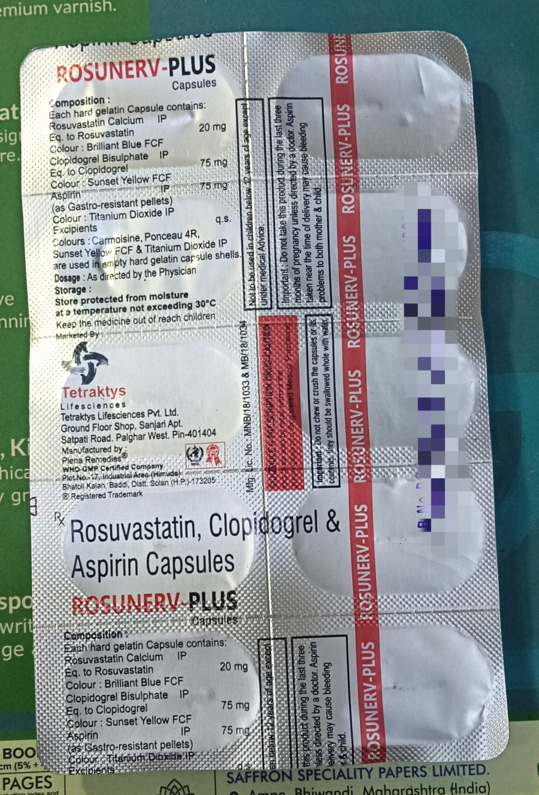 Rosunerv-Plus Capsule is a powerful triple-action heart care medicine containing Rosuvastatin 20 mg, Clopidogrel 75 mg and Aspirin 75 mg, specially formulated to lower bad cholesterol, prevent harmful blood clots, and reduce the risk of heart attack and stroke. It works by controlling cholesterol levels, improving blood flow, and protecting arteries from blockage. This combination is commonly prescribed for patients with high cholesterol, a history of cardiac events, hypertension, diabetes, or increased cardiovascular risk. Rosunerv-Plus supports long-term heart health, helps prevent future heart complications, and should be taken only under medical supervision.