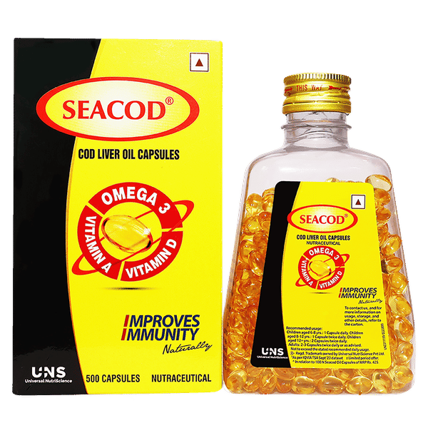 SeaCod Cod Liver Oil (500 softgels) provides concentrated cod liver oil rich in Omega-3 fatty acids along with natural Vitamins A & D, supporting cardiovascular, bone, immune, eye and brain health for adults and children.