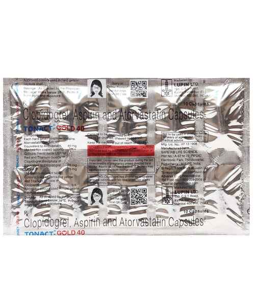 TONACT-GOLD 40 Capsule is a fixed-dose combination medicine commonly prescribed for the prevention and management of cardiovascular diseases. It contains Atorvastatin, which helps lower bad cholesterol (LDL) and triglycerides, Clopidogrel, an antiplatelet agent that prevents blood clots, and Aspirin, which further reduces clot formation by thinning the blood.