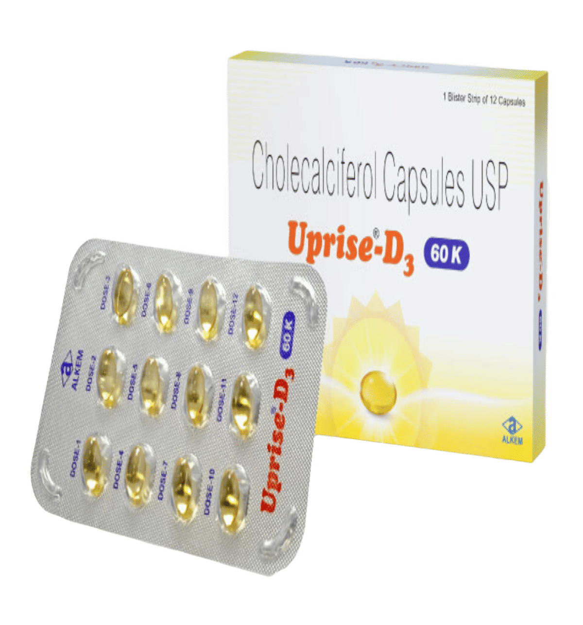 Uprise D3 60K Capsule is a powerful weekly Vitamin D3 supplement designed to treat Vitamin D deficiency, improve calcium absorption, and strengthen bones and muscles. It helps reduce fatigue, body pain, and weakness caused by low Vitamin D levels while supporting strong immunity and overall wellness. Ideal for adults, elderly individuals, people with low sunlight exposure, and those with fragile bones or muscle weakness, this high-strength capsule provides effective and fast results when taken as prescribed.