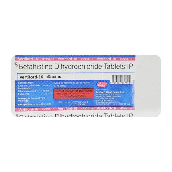Vertiford 16 mg Tablet contains Betahistine, a medicine commonly prescribed for the treatment of vertigo and balance disorders caused by inner ear conditions. It works by improving blood flow in the inner ear and reducing pressure, which helps control symptoms such as dizziness, ringing in the ears, nausea, and hearing disturbances.